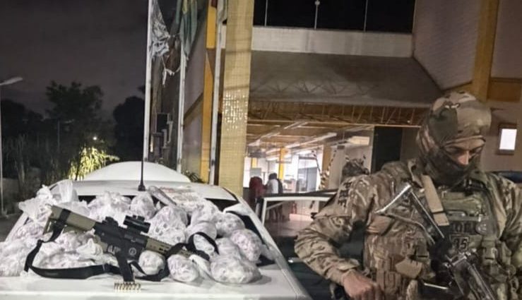 No interior, foram encontrados um simulacro de fuzil, um carregador de pistola municiado com oito munições de calibre 9 mm, uma munição calibre 5,56 mm e 29 invólucros contendo dezenas de “pinos/papelotes” de cocaína.