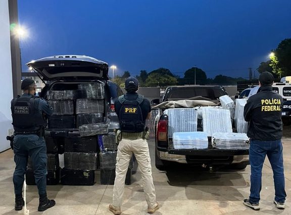 A Polícia Rodoviária Federal (PRF), a Polícia Federal (PF) e a Polícia Militar (PM) apreenderam 1.592 quilos de maconha e recuperaram dois veículos, neste domingo (12), em Mundo Novo (MS).